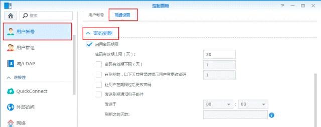 如果是一臺多用戶共用的NAS,除了用戶權限的設定,還可以如下圖設置用戶更改密碼的權限,還能設定此賬號的使用期限。